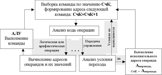 Выполнение команды. Если выполняемая команда есть команда передачи управления, то она передается в устройство управления и, если условия выполняются, то вычисляется исполнительный адрес (адрес перехода), который заносится в счетчик команд.Переход на начало, к шагу 1.