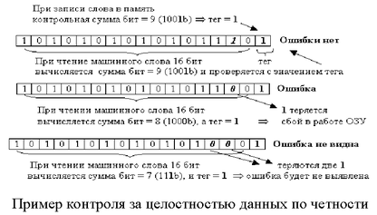 разряды контроля четности машинного слова (при записи машинного слова подсчет числа единиц в коде машинного слова и дополнение до четного или нечетного в контрольном разряде), при чтении контроль соответствия;