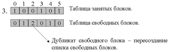 2. Анализируется список свободных блоков. Для каждого номера свободного блока увеличивается на 1 соответствующая ему запись в таблице свободных.