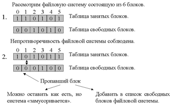 3. таблица занятых блоков корректна, а какой-то из свободных блоков дважды или более раз посчитан свободным, т.е. список свободных блоков (таблица) не корректен. В этом случае нужно запустить процесс пересоздания списка свободных блоков. Т.е. нужно запустить процесс, который проанализирует все индексные дескрипторы и соответственно сформирует список свободных блоков.