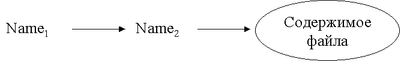 “Символическая” связь есть файл с именем Νame2, этому имени соответствуют атрибуты и соответствует содержимое, и есть специальный файл Νame1, который ссылается на имя Νame2. В этом случае имеет место ассиметричное именование файлов. Имя Νame2 позволяет организовывать более широкую работу с файлом, можно удалять, если файл будет удален, соответственно содержимое пропадет. Имя Νame1 имеет свои правила интепретации, поскольку они идут через ссылку на имя Νame2,т.е. можно осуществлять доступ к содержимому, но если удалить файл Νame1, то содержимое Νame2 останется неизменным.