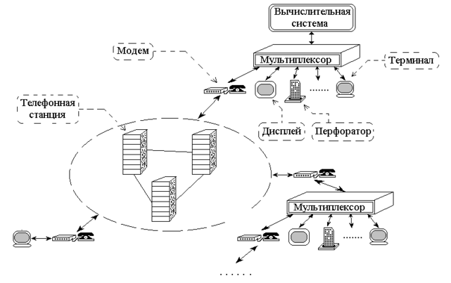 Телефонная сеть состоит из набора телефонных станций, объединенных друг с другом линиями связи. Связь абонентов телефонной в том числе и связь удаленных терминалов с вычислительной системой осуществляется с использованием коммутируемого канала, либо по выделенным каналам. Суть соединения через коммутируемый канал заключается в том, что при нескольких звонках к одному и тому же абоненту, раз от раза маршруты коммутации (т.е. набор проводов, по которым идет сообщение) отличаются друг от друга, за счет того, что каждый раз выбираются свободные каналы в телефонных станциях по пути соединения. После завершения сеанса связи между абонентами коммутируемый канал освобождается. При использовании выделенного канала маршрут коммутации между абонентами фиксируется на период аренды выделенного канала. Достоинства/недостатки использования коммутируемых и выделенных каналов очевидны.