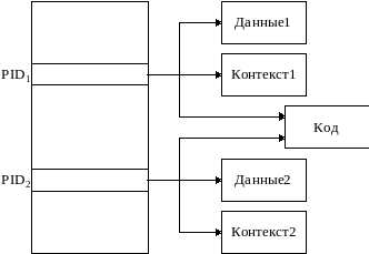 Тело процесса, - как уже было сказано, можно представить в виде объединения сегмента текста (кода) и сегмента данных. Развитые ОС позволяют размещать сегменты текста и данных в различных, не зависящих друг от друга, местах оперативной памяти. Это хорошо, так как вместо одного большого куска памяти нам требуется два маленьких. Но еще лучше следующее - такая организация позволяет использовать сегмент кода повторно. В системе допускается существование еще одного процесса с собственным контекстом, сегментом данных, но у которого общий с другими процессами сегмент кода.