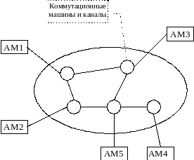 Предположим у нас есть некоторая группа вычислительных машин, которые мы будем называть абонентскими машинами (АМ). Имеется некоторое образование, которое называется коммутационной средой. Коммутационная среда включает каналы передачи данных, обеспечивающие взаимодействие между машинами, специальные вычислительные машины, которые мы будем называть коммутационными машинами. Абонентские машины могут осуществлять взаимодействие друг с другом через коммутационную среду, в рамках которой используются каналы передачи данных и коммутационные машины.