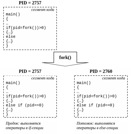 По завершении системного вызова fork() каждый из процессов – родительский и порожденный – получив управление, продолжат выполнение с одной и той же инструкции одной и той же программы, а именно с той точки, где происходит возврат из системного вызова fork(). Вызов fork() в случае удачного завершения возвращает сыновнему процессу значение 0, а родительскому PID порожденного процесса. Это принципиально важно для различения сыновнего и родительского процессов, так как сегменты кода у них идентичны. Таким образом, у программиста имеется возможность разделить путь выполнения инструкций в этих процессах.