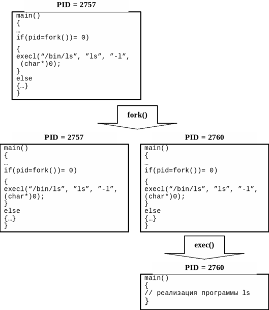 Семейство системных вызовов exec() производит замену тела вызывающего процесса, после чего данный процесс начинает выполнять другую программу, передавая управление на точку ее входа. Возврат к первоначальной программе происходит только в случае ошибки при обращении к exec() , т.е. если фактической замены тела процесса не произошло.