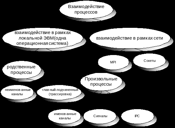 При взаимодействии родственных процессов проблема именования решается за счет наследования потомками некоторых свойств одного из прародителей. Например, в случае неименованных каналов процесс-родитель для организации взаимодействия создает канал. Этот канал наследуется сыновними процессами, тем самым создается возможность организации симметричного (ибо все процессы изначально равноправны) взаимодействия родственных процессов. Другой пример, это взаимодействие процессов по схеме главный-подчиненный (или трассировка). Данный тип взаимодействия ассиметричный, так как изначально один из взаимодействующих процессов получает статус и права «главного», второй - «подчиненного». Главный – это родительский процесс, подчиненный – сыновний. Соответственно именование жестко привязано к связке отец-сын (идентификаторы сына и отца всегда доступны и однозначно определены).