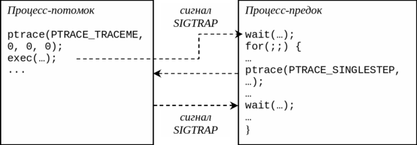 Предназначение процесса-потомка — разрешить трассировку себя. После вызова ptrace(PTRACE_TRACEME, 0, 0, 0) ядро устанавливает для этого процесса бит трассировки. Сразу же после этого можно заместить код процесса-потомка кодом программы, которую необходимо отладить. Отметим, что при выполнении системного вызова exec(), если для данного процесса ранее был установлен бит трассировки, ядро перед передачей управления в новую программу посылает процессу сигнал SIGTRAP. При получении данного сигнала трассируемый процесс приостанавливается, и ядро передает управление процессу-отладчику, выводя его из ожидания в вызове wait().