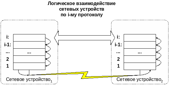 Заметим, что несмотря, на декларацию о том, что общение ВС в сети происходит между одноименными протоколами, реальная обработка взаимодействия заключается в последовательной передаче сообщения от протокола i-го уровня на одной ВС к i-1, i-2,… и, наконец, физическому уровню на этой же ВС, который должен обеспечить физическую передачу сообщения физическому уровню ВС – получателя, и последовательному «подъему» по уровням ВС – получателя, до соответствующего одноименного протокола i-го уровня.