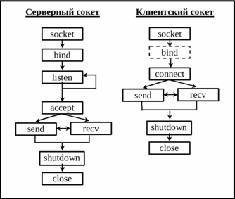 Мы рассмотрели все основные функции работы с сокетами. Обобщая изложенное, можно изобразить общую схему работы с сокетами с установлением соединения в следующем виде: