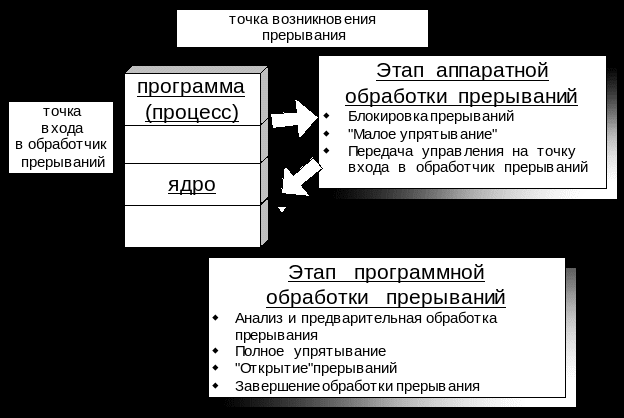 Обработка прерывания предполагает сохранение возможности корректного продолжения прерванной программы (процесса) с точки прерывания. Поэтому следующий шаг аппаратной обработки – “малое упрятывание“ – копирование в специальную регистровую память ЦП (регистровый буфер, таблицу) минимального количества регистров и настроек ЦП, достаточных для запуска программы ОС, обрабатывающей прерывания. Это заведомо счетчик команд, регистр результата, некоторое количество регистров общего назначения. Следует отметить, что возможно организовать копирование (или упрятывание) всех регистров, используемых программой, но это, в общем случае, нецелесообразно, так как может потребовать значительных объемов регистровой памяти, а также потребует значительного времени работы в режиме блокировки прерываний.