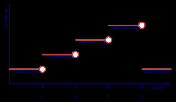 На рисунке изображена подобная мультипрограммная система, обрабатывающая одновременно 4 программы (процесса). t1 – момент времени в который программа1 будет остановлена для ожидания завершения обмена (до момента времени t4). В момент времени t1 система запускает выполнение программы2, которая выполняется до момента времени t2. С t2 программа2 также начинает ждать завершения своего обмена и т.д.