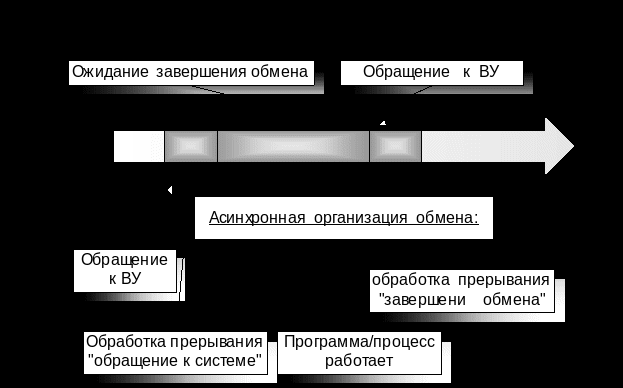 При синхронной организации обмена программа будет приостановлена с момента обращения к ВУ до момента завершения обмена. Дисбаланс между скоростью выполнения машинных команд и скоростью работы ВУ колоссальный. Поэтому задержки при синхронной работе крайне и крайне ощутимы.