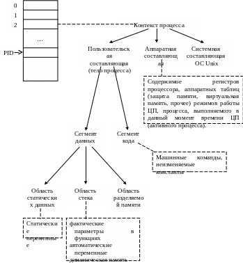 одержимое записи таблицы процессов позволяет получить контекст процесса (часть данных контекста размещается непосредственно в записи таблицы процессов, на оставшуюся часть контекста имеются прямые или косвенные ссылки, также размещенные в записи таблицы процессов).