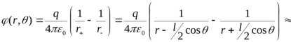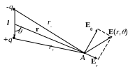 айти потенциал и модуль Е напряженности поля диполя как функции r и (r – расстояние от центра диполя, – угол между осью диполя и направлением от центра диполя к данной точке). Дипольный момент равен p = ql, l – “плечо диполя”. Считать r l.