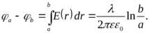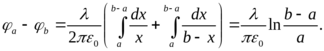 По данным задачи b >> a. Это позволяет считать, что заряды по поверхности проводников распределяются равномерно и напряженность электрического поля между проводами можно найти, используя выражение (6.12) и принцип суперпозиции полей: E(r) = E+(r) + E(r). Для вычисления разности потенциалов между проводами выберем простейший путь – вдоль прямой силовой линии, соединяющей провода. В любой точке с координатой х на этой линии напряженность равна