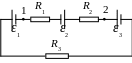 а рисунке изображена цепь постоянного тока, состоящая из трех источников тока и трех сопротивлений, включенных последовательно. ε1 = 2 В, ε2 = 5 В, ε3 = 2 В, R1 = 1 Ом, R2 = 2 Ом, R3 = 3 Ом. Определить разность потенциалов 1 2 между точками 1 и 2. Внутренним сопротивлением источников тока и соединительных проводов пренебречь.