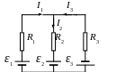 схеме, изображенной на рисунке ε1 = 10 В, ε2 = 20 В, ε3 = 30 В, R1 = 9 Ом, R2 = 7 Ом, R3 = 12 Ом. Найти токи I1, I2, I3. Внутренними сопротивлениями источников пренебречь.
