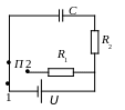 онденсатор емкости С = 5 мкФ подсоединен к источнику постоянного тока с напряжением U = 200 В. Затем переключатель П переводится с контакта 1 на контакт 2. Найти количество тепла Q, выделившееся на сопротивлении R1 = 500 Ом. Сопротивление R2 = 300 Ом. Сопротивлением проводов пренебречь.