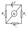 пределить ЭДС батареи ε, пренебрегая ее внутренним сопротивлением в схеме, указанной на рисунке. R1 = R2 = R3 = 100 Ом. Вольтметр показывает напряжение U = 200 B, сопротивление вольтметра Rv = 800 Ом. -