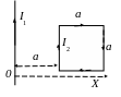 Контур из провода, изогнутого в форме квадрата (см. рис. к задаче 11.1) со стороной а = 0,5 м, расположен в одной плоскости с очень длинным прямым проводом с током I1 = 6 А так, что две его стороны параллельны проводу. Сила тока в контуре I2 = 1 А. Определить силу, действующую на контур, если ближайшая к проводу сторона контура находится на расстоянии b = 10 см. Направления токов указаны на рисунке.