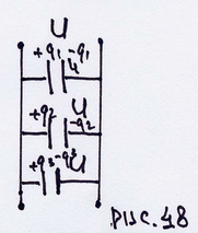 - разность потенциалов на обкладке каждого конденсатора. Такое соединение конденсаторов называется последовательным, т.к.