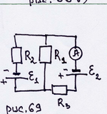 Какую силу тока показывает амперметр в схеме, изображённой на рис. 69, если