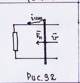 ассмотрим знакомый нам пример с проводником, движущимся по рельсам со скоростью в магнитном поле с индукцией перпендикулярном плоскости, в которой лежат рельсы (рис. 92).