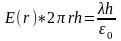 . Заряд – положительный. Из-за симметрии следует, что Е поля в каждой точке должна быть направлена вдоль радиальной прямой, перпендикулярной к оси цилиндра, а величина Е может зависеть только от расстоянии r от оси цилиндра. Представим себе замкнутую цилиндрическую пов-ть радиуса r и высоты h. Для оснований цилиндра Е=0, для боковой поверхности Е=Е(r) . Значит поток вектора напряженности через рассматриваемую поверхность равен: