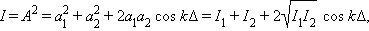 В частности, если I1 = I2 = I0, т. е. интенсивности обеих интерферирующих волн одинаковы, выражение (*) приобретает вид: