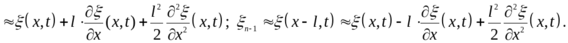 Переходя к непрерывной среде, устремим число осцилляторов к бесконечности, а l – к нулю и получим гладкую функцию (x, t). Пусть x – координата n-го осциллятора; тогда, разложив в ряд Тейлора, а также считая, что в процессе колебаний расстояние между соседними осцилляторами изменяется мало, получим: