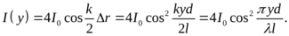 В опыте Юнга лучи от одного и того же источника проходят через разные отверстия в экране, поэтому реализуется схема интерференции от двух точечных источников. Интерферирующие лучи имеют одну и ту же амплитуду, поэтому в каждой точки «складываются» два луча: