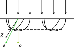 Многие кристаллы обладают свойством оптической анизотропии, то есть по-разному пропускают свет вдоль разных направлений. Причиной этого эффекта является различие периодов решётки кристалла вдоль разных осей. Рассмотрим только так называемые одноосные кристаллы, в которых имеется одно выделенное направление, а все направления, перпендикулярные к выделенному, эквивалентны. Выделенное направление называется оптической осью кристалла. Поляризация одноосного кристалла будет происходить по-разному вдоль разных направлений, поэтому диэлектрическая проницаемость (и, значит, показатель преломления) будет зависеть от направления. Показатель преломления вдоль оптической оси (Z) обозначается как ne, а в перпендикулярных направлениях – no. Пространственная зависимость показателя преломления кристалла от направления колебаний Е имеет вид эллипсоида вращения с полуосями ne и no. Если