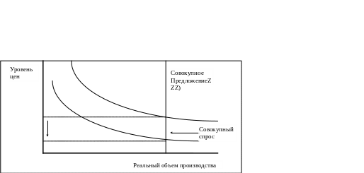 Кривая совокупного предложения вертикальная, она отражает только объем производства. Совокупный спрос обычно стабилен, но если он сокращается, то снижаются цены.