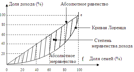 Теоретическая возможность абсолютного равного распределения дохода – биссектриса. Она показывает, что любой данный процент семей получает соответствующий процент дохода. 20% семей получают 20% дохода. Если 1% семей имеют 100% дохода, то это абсолютное неравенство семей.