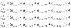 Алгоритм для двумерных данных реализуется аналогично. Если у нас есть квадрат из 4 точек с яркостями a2i,2j, a2i+1, 2j, a2i, 2j+1, и a2i+1, 2j+1, то