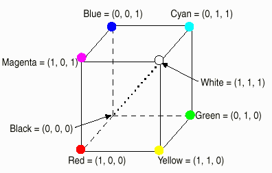 В этих случаях широко применяется модель RGB. Цветовое пространство задается как куб в декартовой системе координат. Каждый цвет задается точкой в этом кубе и определяется как сумма основных цветов (primaries). Основные цвета (красный, зеленый и синий) являются аддитивными основными цветами. Главная диагональ куба с равными количествами каждого основного цвета представляет ахроматические (серые цвета): черному цвету соответствует точка (0, 0, 0), а белому -- (1, 1, 1).