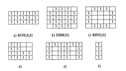 Структурный элемент суть тоже некоторое двоичное изображение (геометрическая форма – shape). Он может быть произвольного размера и произвольной структуры. Чаше всего используются симметричные элементы, как прямоугольник фиксированного размере (BOX(l,w)), или круг некоторого диаметра (DISK (d)). В каждом элементе выделяется особая точка, называемая начальной (origin). Она может быть расположена в любом месте элемента, хотя в симметричных это обычно центральный пиксел.