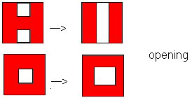 По рассмотренной выше схеме выполняются базовые (basic) операции. Такими операциями являются расширение (dilation) и сужение (erosion). Производные операции – это некоторая комбинация базовых, выполняемых последовательно. Основными из них являются открытие (opening) и закрытие (closing).