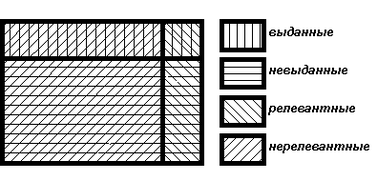 Идеальная ИПС должна выдавать документы, содержательно релевантные запросу, и ничего кроме них. Однако на практике это обычно не достигается, наблюдаются молчание ИПС (невыдача некоторого количества релевантных документов) и шум (выдача лишних документов). Массив документов разделяется на выданные и невыданные - по одному критерию, и на релевантные и нерелевантные - по другому.