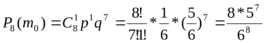 m0=1 - найвероятнешее число выпадений «6» при восьми бросках кубика.