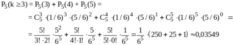 А) Р5(3) = С53 (1/6)3(5/6)2 =