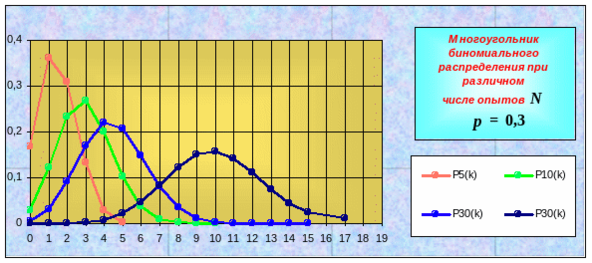 Замечание. В биноминальном распределении при большом числе опытов N пользоваться формулой Бернулли сложно (теряется точность расчетов). Поэтому используются т.н. предельные случаи биноминального распределения: