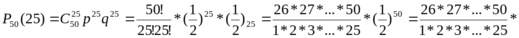 Найти вероятность того, что при 50 бросках монеты герб появится в половине случаев.