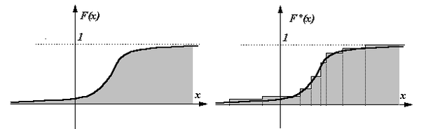Если построить график статистической функции распределения F*(x), то это будет изображенная справа ступенчатая фигура, которая позволяет получить представление о характере теоретической функции распределения F(x).