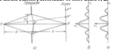 Если изменять ширину щели, сдвигая полуплоскости в противоположные стороны, интенсивность в средней точке Р будет пульсировать, проходя попеременно через максимумы (а) и отличные от нуля минимумы (б). |