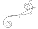 | 19. Дифракция от щели. Бесконечно длинную щель можно образовать, расположив ряжом две обращенные в разные стороны полуплоскости. Следовательно, задача и дифракции Френеля от щели может быть решена с помощью спирали Карню. Волновую пов-ть падающего света, плоскость щели и экран, на котором наблюдается дифракционная картина, будем считать параллельными друг другу. Для точки Р, лежащей против середины щели, начало и конец результирующего вектора находятся в симметричных относительно начала координат точках спирали. Если сместиться в точку Р’, лежащую против края щели, начало результирующего вектора переместится в середину спирали О.
