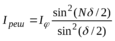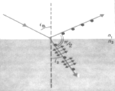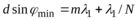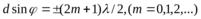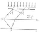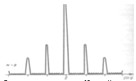 | 22. Дифракция решетки. Дифракционная картина на решетке определяется как р-тат взаимной интерференции волн, идущих от всех щелей. Т.е. в диф. решетке осуществляется многолучевая интерференция когерентных дифрагированных пучков света, идущих от всех щелей. Пусть плоская монохроматическая волна падает нормально к пл-ти решетки Так как щели нх-ся на одинак. друг от друга расст., то разность хода лучей, идущих от двух соседних щелей, будут для данного направления одинаковы в пределах всей дифракционной решетки: . Очевидно что в тех направлениях ,в которых ни одна из щелей не распространяет свет, он не будет распространяться и при двух щелях, т.е. прежние минимумы интенсивности будут наблюдаться в направл, опред-мых усл-ием (m=1,2,3,…). Кроме того, вследствие взаимной интерференции световых лучей, посылаемых двумя щелями, в некоторых направлениях они будут гасить друг друга, т.е. возникнут дополнительные минимумы. Очевидно, что эти дополнительные минимумы будут наблюдаться в тех направлениях, которым соответствует разность хода лучей , посылаемых, например, от крайних левых точек М и С обеих щелей. Условие дополнительных минимумов: . Наоборот, действие одной щели будет усиливать действие другой, если (m=0,1,2,.) т.е. условие максимумов. При двух щелях между двумя главными максимумами располагается один дополнительный минимум, а между каждыми главными максимумами при трех щелях располагается два дополнительных минимума, при четырех – три. Если диф. реш. состоит из N щелей, то условием главных минимумов является условие (m=1,2,3,…), а усл. главных максимумов -- (m=0,1,2.) а условием дополнительных минимумов , где может принимать все целочисленные значения, кроме 0, N, 2N,…, т.е. тех, при которых переходит в . Следовательно, в случае N щелей между двумя главными максимумами располагается N-1дополнительных минимумов, разделенных вторичными максимумами. Чем больше щелей N, тем большее количество световой энергии пройдет через решетку, тем больше минимумов образуется между соседними главными максимумами, тем, след, более интенсивными и более острыми будут максимумы. На след рисунке представлена картина от восьми щелей. Так как | | не может быть больше 1, то , т.е. число главных максимумов определяется отношением периода решетки к длине волны. |