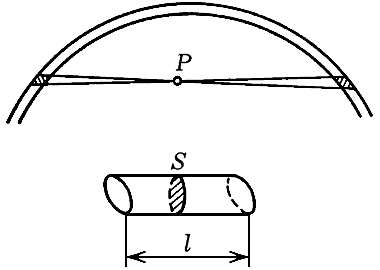 Рассмотрим внутри шара, ограниченного бесконечно тонким шаровым слоем, точку P (рис. 6), возьмём маленький телесный угол с вершиной в P и докажем, что силы, с которыми на помещённое в точке Р тело действуют два бесконечно малых объёма, высекаемых этим углом из шарового слоя, уравновешиваются. (Сейчас, преподавая анализ, не очень-то любят говорить о бесконечно малых величинах, из-за чего современные студенты не вполне владеют этим языком. Между тем им всё-таки владеть надо.) Эти два объёма представляют собой бесконечно малые призмы (их образующие, конечно, слегка расходятся, но величиной этого раствора можно пренебречь, так как ошибка будет бесконечно малой более высокого порядка), объёмы которых можно вычислять по формуле V = lS, где l — длина бокового ребра, a S — площадь поперечного сечения. Но рёбра у наших призм равны как отрезки, высекаемые на прямой парой концентрических окружностей, а поперечные сечения относятся как квадраты расстояний до Р. Таким образом, эти два объёма тянут тело в точке Р в разные стороны с одинаковыми силами. Точно так же уравновешиваются и все другие влияния, поэтому равнодействующая всех сил равна нулю.