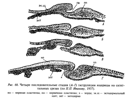 В задней части зародышевого щитка формируется клеточное скопление, называемое первичной пластинкой, а в его центре – круглое углубление, гомологичное бластопору. Бластопор ведет во впячивание, растущее вперед (рис. 66, А, Б) и затем прорывающееся в пространство между эпи- и гипобластом (рис. 66, В, Г). Впячивание называется мезодермальным мешочком, поскольку из его боковых стенок образуется мезодерма, а из верхней стенки – хорда. Как мы помним, такой же эмбриональный материал погружается в области гензеновского узелка у птиц, что и демонстрирует глубокую гомологию между развитием птиц и рептилий. С другой стороны, наличие хорошо выраженного бластопора и присутствие у большинства рептилий (ящерицы, змеи и черепахи) округлой первичной пластинки взамен вытянутой первичной полоски птиц сближают зародыши рептилий с анамниями, особенно с зародышами акуловых рыб.
